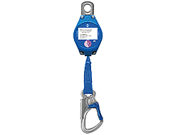 Zatahovací zachycovač pádu v hliníkovém pouzdře s ocelovým lankem, vybavený pevným kotevním okem a otočnou karabinou s indikátorem pádu