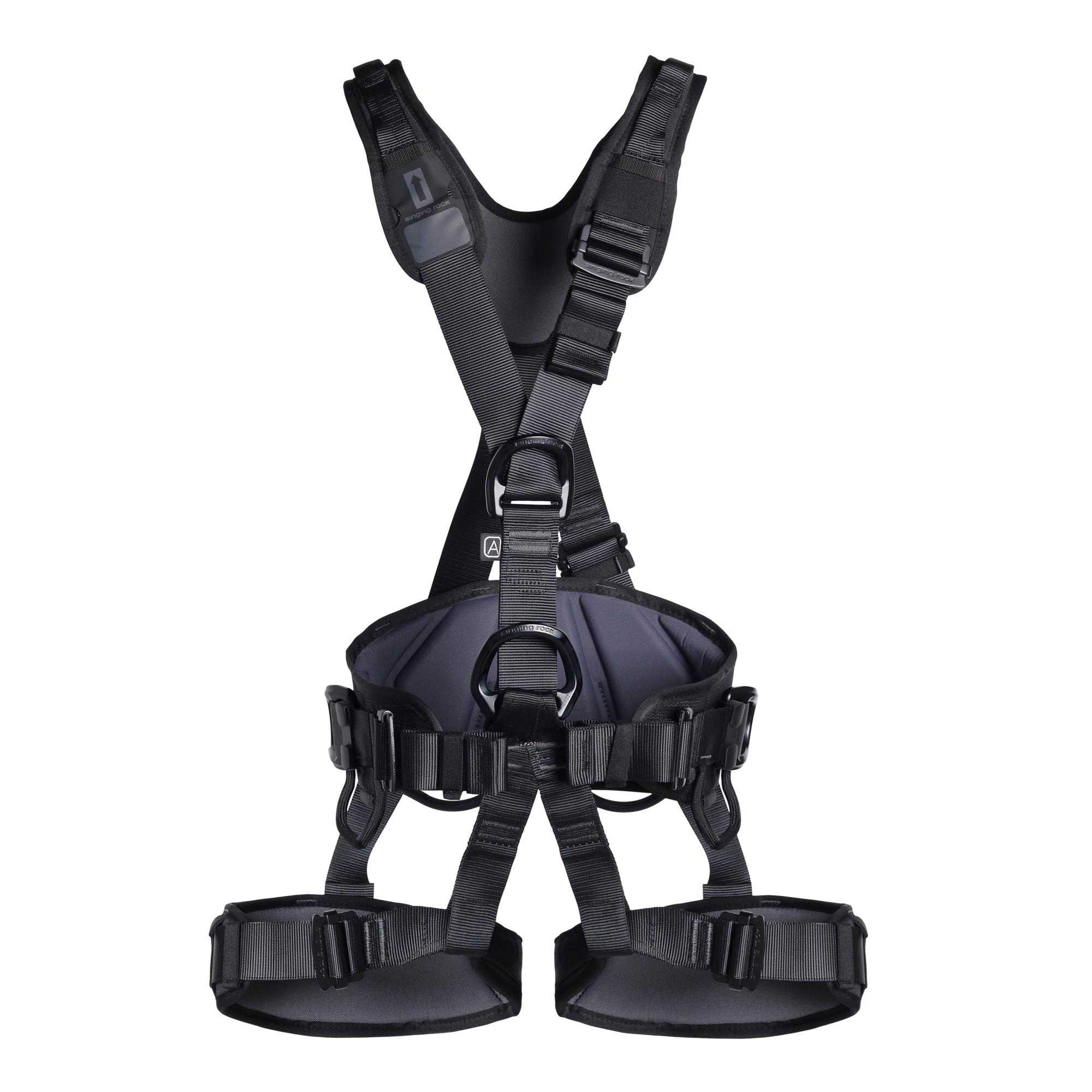 Plně nastavitelný postroj s průběžnými nastavovacími popruhy a Easy-lock sponami pro pracovní polohování, s širokým polstrovaným bederním pásem, anatomicky tvarovanými nohavičkami a ramenními popruhy.