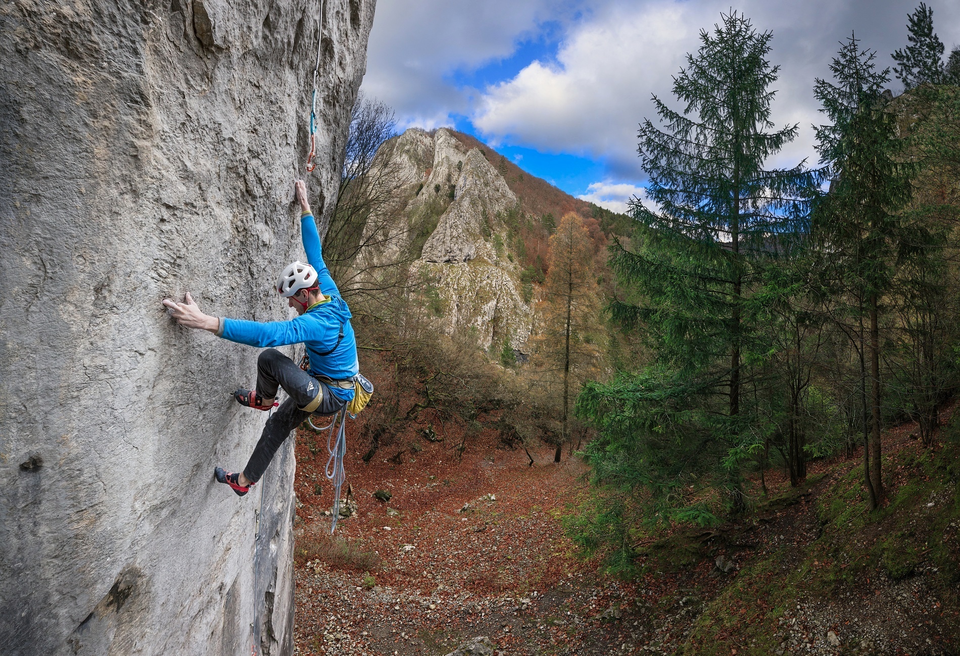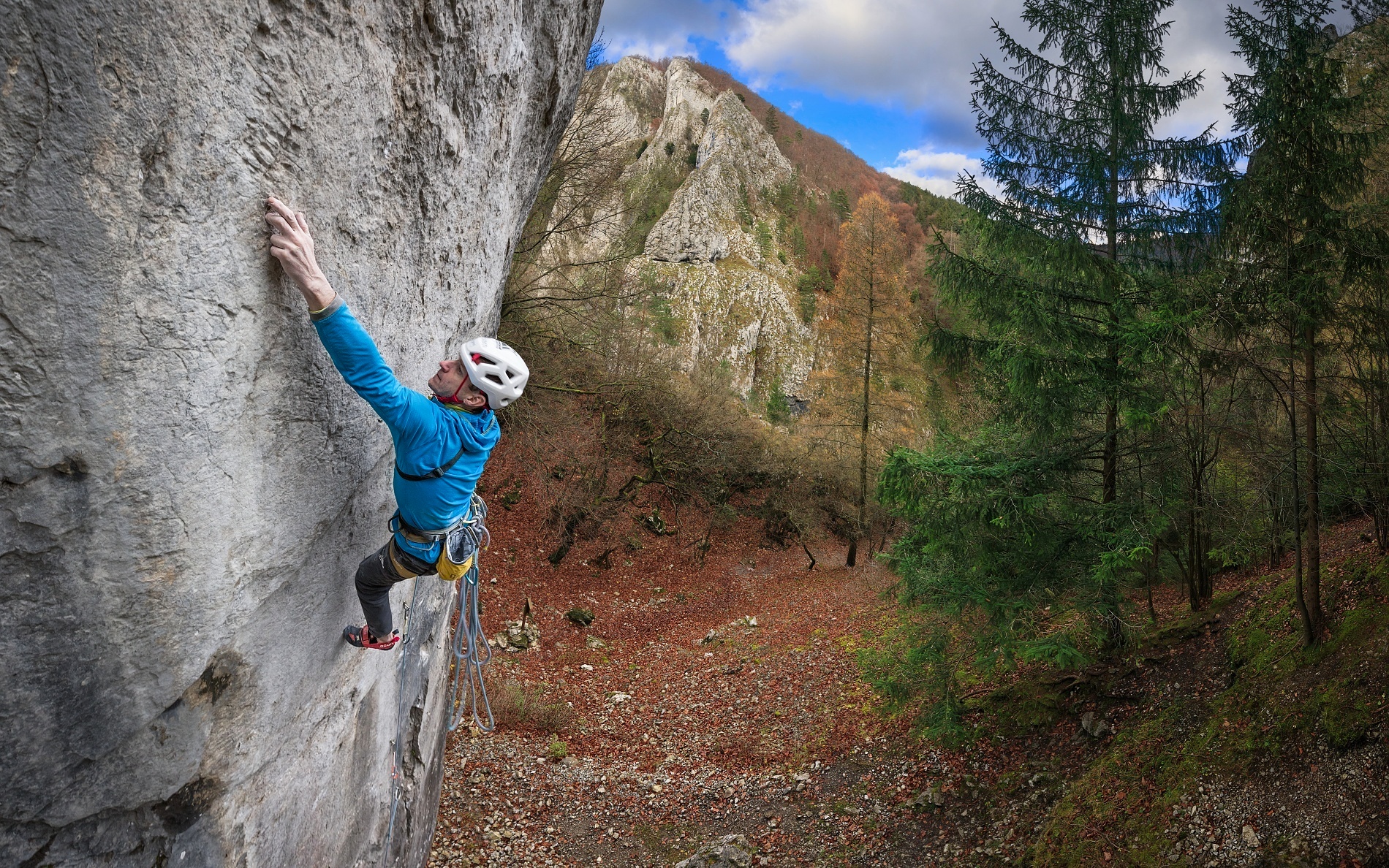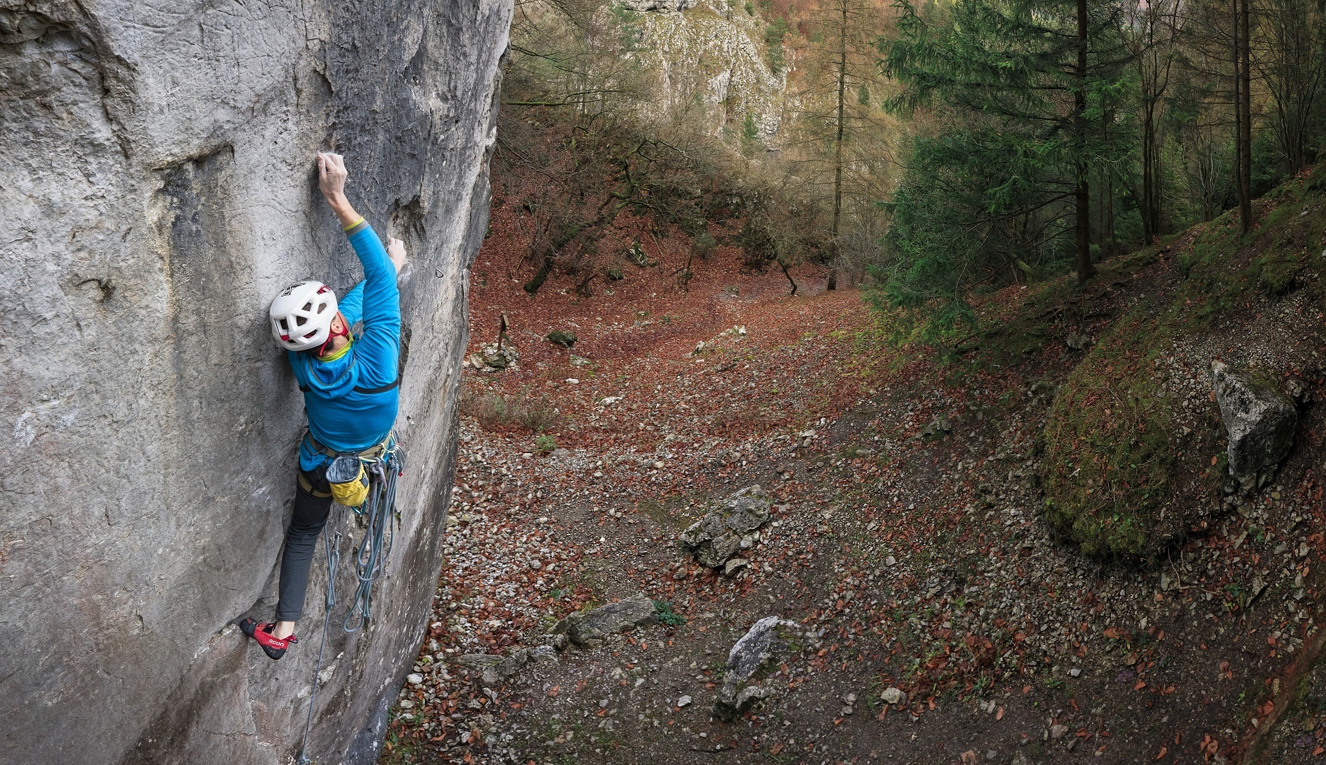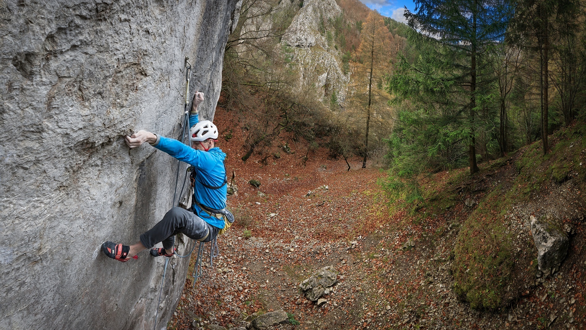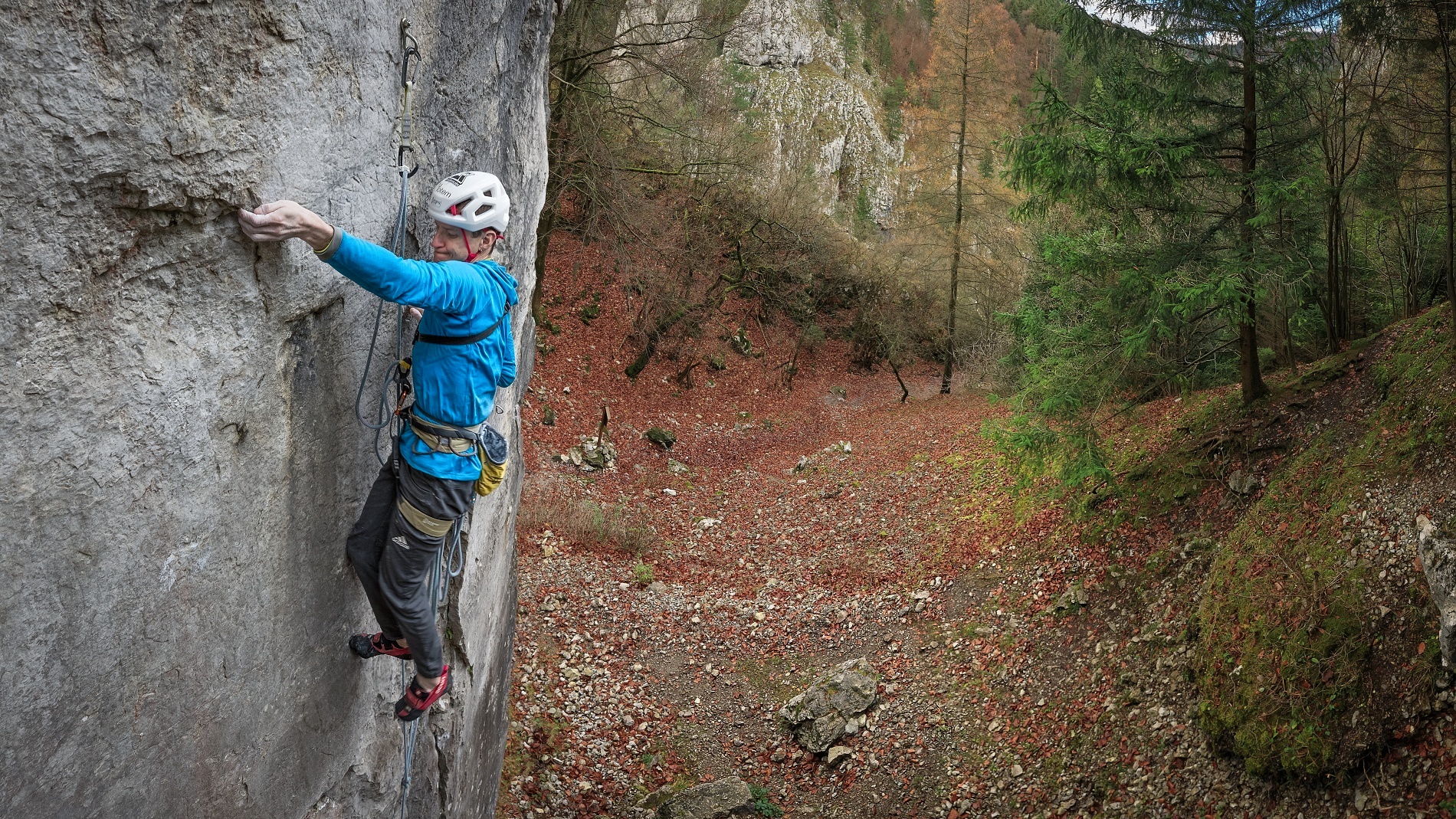 Střih. První skály po úrazu byl průlez Kežmaráku na druhém, ale jen díky nástupu pomocí e-biku. Při druhé návštěvě jsem se již s Martinem střídal v tahání délek (nejtěžší jsme vylezli oba) a při třetí jsem si dal psychický test a vylezl Superdiretisimu jištěným sólem. Hlava tedy byla připravená, ale tělo ještě ne, a hrozilo, že ty podzimní podmínky opět nestihnu. Mentálně to pak bylo náročné ze třech důvodů. První, že pata/kotník byly ještě citlivé a odskoky dost nepříjemné (fyzicky i psychicky). Druhým bylo to, že fyzicky jsem na to měl už i s rezervou, ale při sólo jištění to x-krát skončí na seknutí lana v jistítku nebo backupovém uzlu ve špatném místě atd. atd. – tzn. že to nezáleželo jen na mě. A třetí nenápadný důvod byl ten, že se jednalo o překonání mé nejvyšší dosažené klasifikace. Vědomě mě to sice nebrzdilo, ale kdo ví, jak velkou roli to v kombinaci s předchozími důvody hrálo podvědomě.