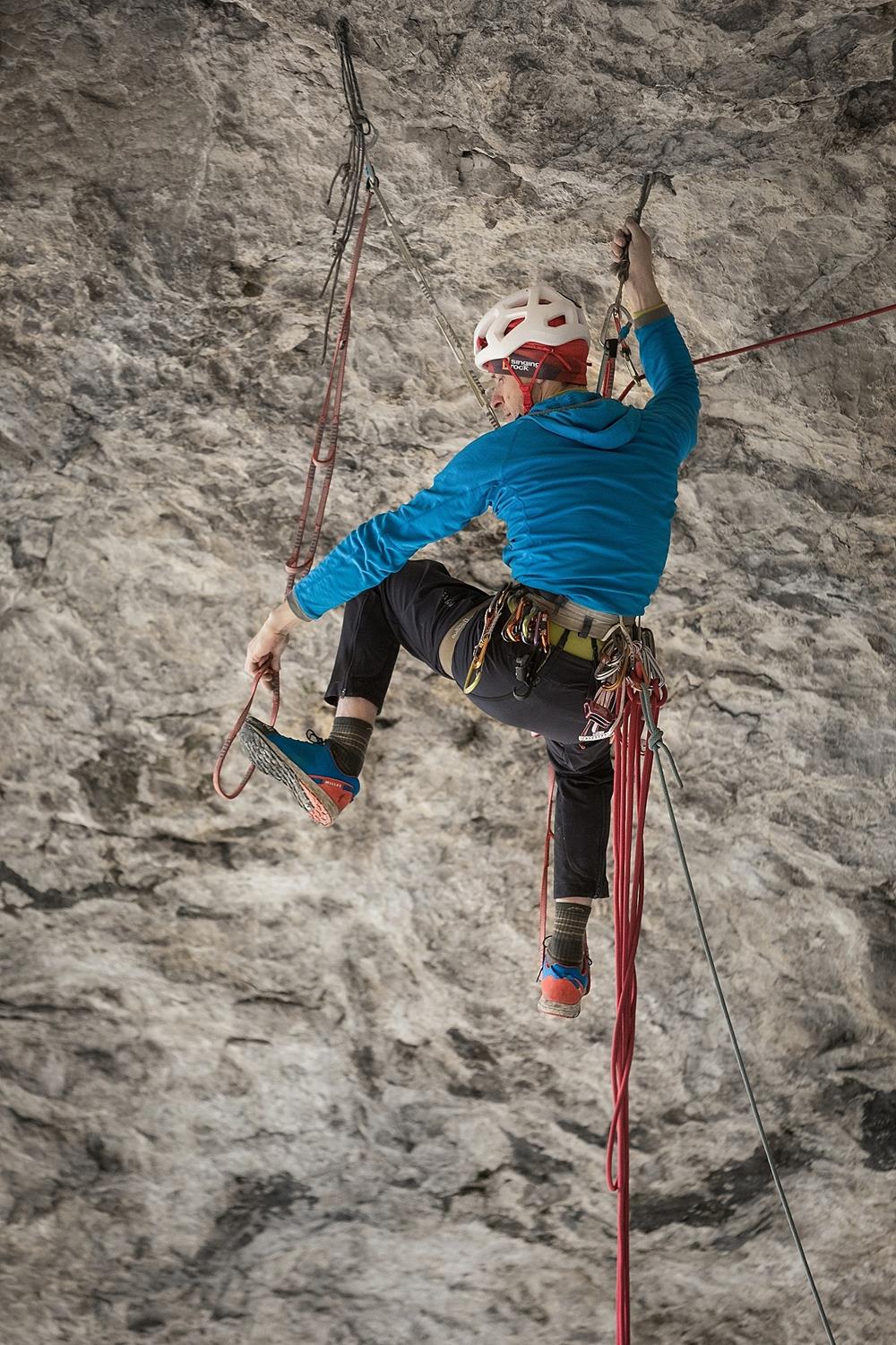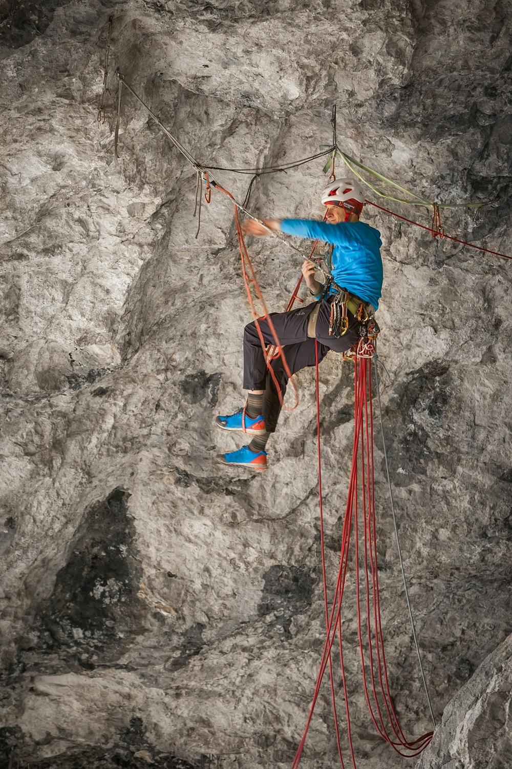 Zpátky k lezení. Loni na podzim jsem kvůli expedici v Pákistánu a z ní přivezeném střevním dárečku, ale i kvůli práci a podobným „dospěláckým“ důvodům, neměl moc času cestu vylézt, resp. výkonnost na přelez byla, ale počasí už ne. Takže kalendář jsem otočil podruhé. Na začátku dubna jsem byl v dobré formě a LRS systém jsem měl konečně docela dobře vyladěný. Byla ale až moc velká zima na malé chyty. Dostal jsem se do high pointu, kde jsem při cvičném kontrolovaném odskoku měl vyzkoušené, že pád může být delší, ale ne nebezpečný. Nicméně ve dvouprstovce jsem vůbec necítil zmrzlé/odkrvené prsty a vypadnul jsem. Více od stěny než při testu. Letěl jsem do oblouku a přibilo mě to do stěny. Slanil jsem a s bolestí na připraveném druhém laně vyšplhal nahoru vyčistit materiál. Dobelhal jsem k autu, a ještě dojel domů. Zlomená pata na více kusů, ale alespoň tak, že se to obešlo bez šroubů, resp. operace. Nechodící sádra na měsíc, a další s francouzskými holemi. Vzpomněl jsem si samozřejmě na Dave McLeoda, který si také zranil kotník při dlouhém pádu v Rhapsody. Dlouhodobý projekt, který poté vylezl…