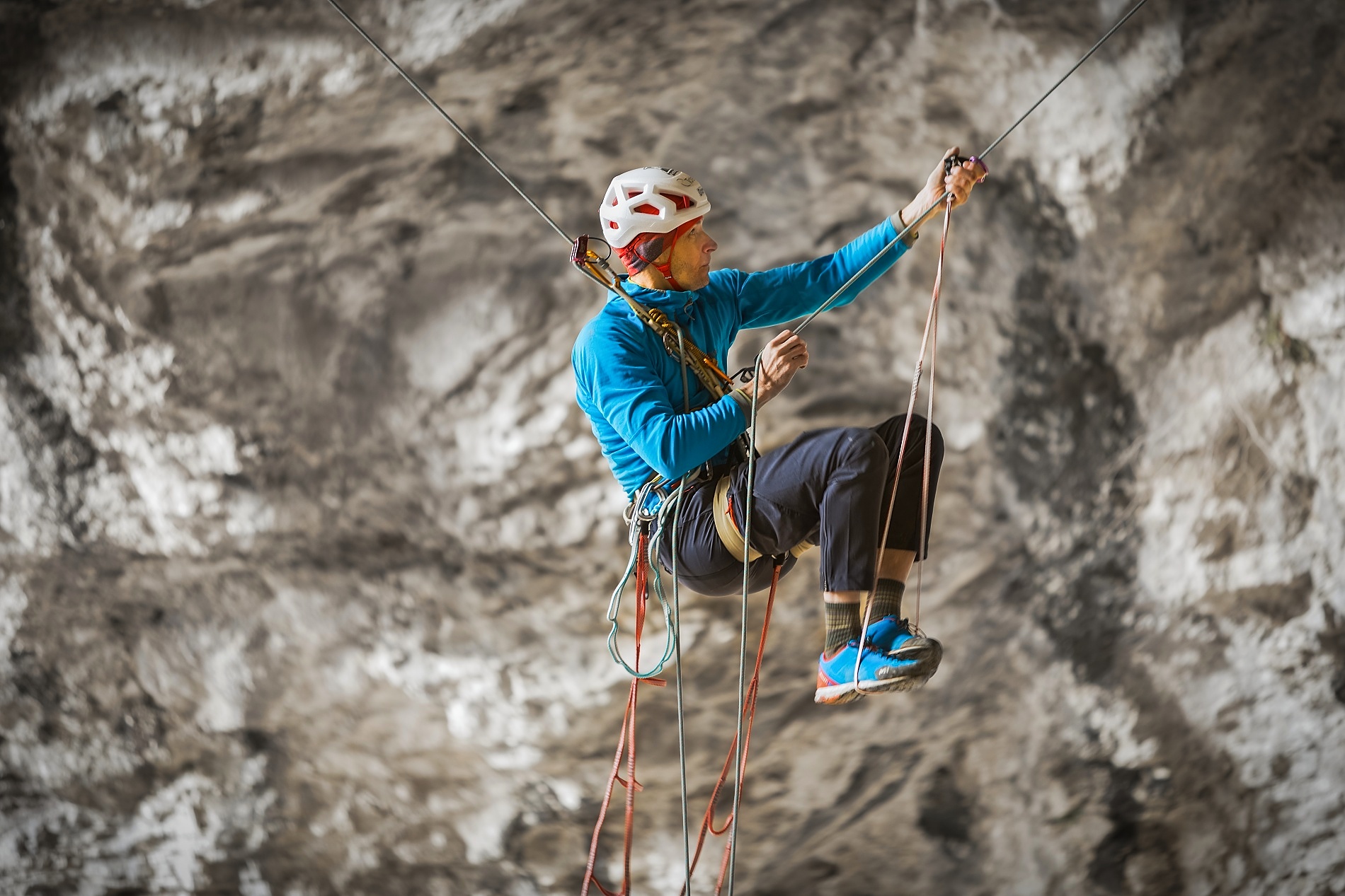 Celý proces v Gekónovi jsem, byť nezáměrně, započal sám. Tak mi přišlo logické v něm sám pokračovat. Na podzim 2023 jsem tedy začal zkoušet, zda by to (pro mě) vůbec technicky šlo na LRS. Vyzkoušel jsem několik systémů a lan. U jednoho nejmenovaného jistítka jsem dokonce při pádu urval oplet lana a zůstal na jádrech o hodně níže, než jsem předpokládal…