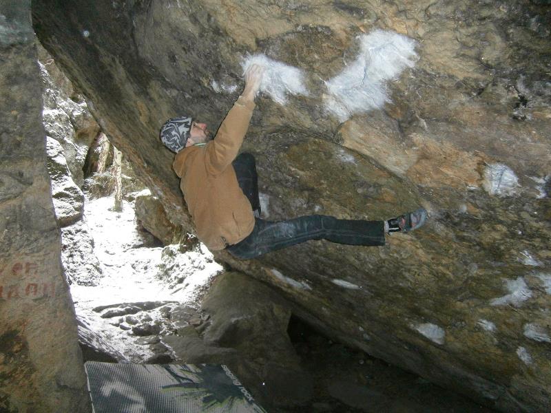 Úvod po lištách mi docela jde, pak přichází technická pata, do které si musím dobře lehnout, po pár pokusech mi tento krok nedělá problém. Největší problém je následný daleký krok z lišt do slušného chytu, pak přenést váhu do ruky, přídrž a topový chyt. Vše mám připravené na přelez, ale chyba lávky v boulderu tvrdnu dvě hodiny i když dávám velice slušné pokusy, skoro vždy neudržím skok doprava a začínám být dost nervózní, přelez ne a ne přijít, naštěstí bojovnost a zarputilost přináší svoje ovoce, jak držím topový chyt, cítím ohromnou radost a úlevu, že už to nemusím lézt."